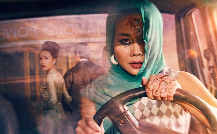 Teaser poster phim mang phong cách retro thập niên 1960, hình ảnh Cầm Thanh (Thanh Hằng) đầy ám ảnh với những mảng da bong tróc, loang lổ vết máu và sẹo chằng chịt. Gương mặt tàn tạ có ánh nhìn hận thù và đang cầm lái một chiếc xe.