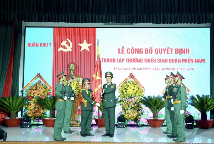Thượng tướng Nguyễn Trường Thắng - Thứ trưởng Bộ Quốc phòng - trao quân kỳ quyết thắng - lá cờ biểu tượng cho truyền thống quyết chiến, quyết thắng của Quân đội nhân dân Việt Nam - cho Trường Thiếu sinh quân miền Nam - Ảnh: LÊ PHAN