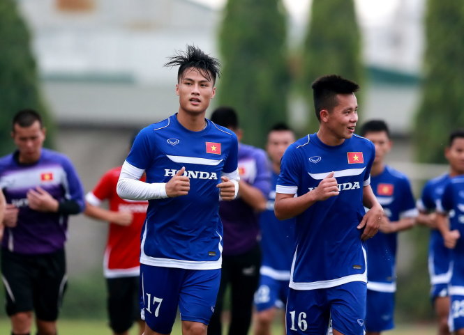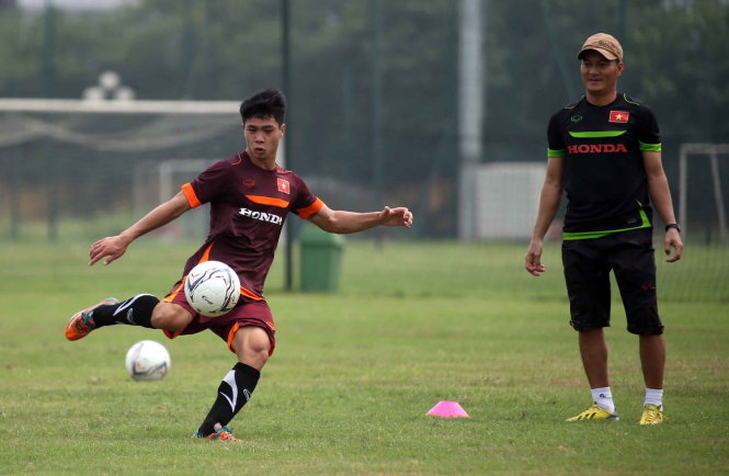 | Tiền đạo Mạc Hồng Quân (trái) tập với đội U-23 VN vào chiều 7-5. Ảnh: Nam Khánh |