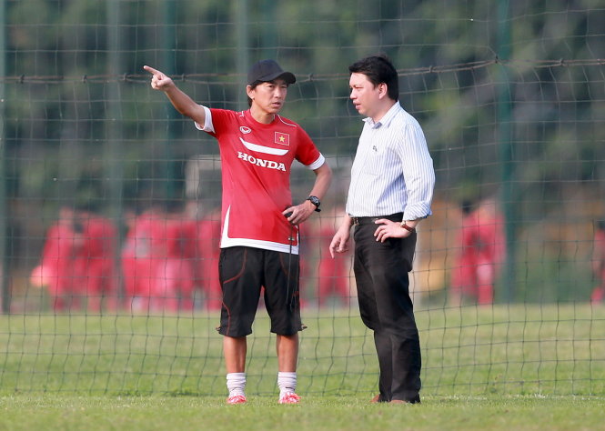 | HLV Miura (trái) trao đổi với Tổng thư ký VFF Lê Hoài Anh trên sân tập chiều 7-5. Ảnh: Nam Khánh |