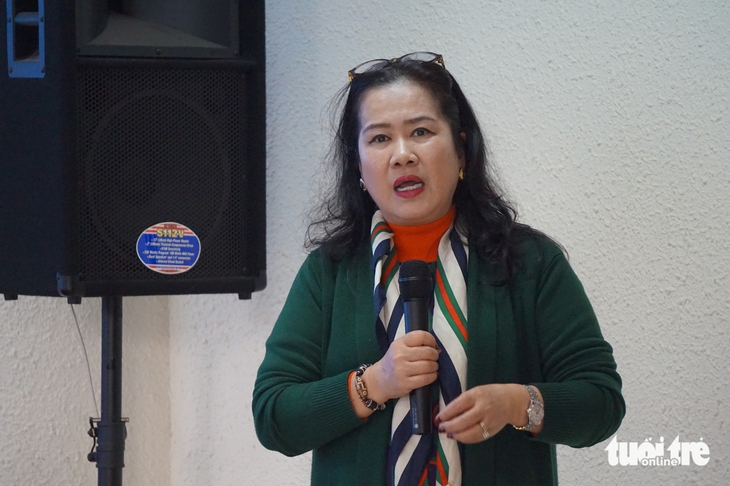 Nhà văn Nguyễn Thị Thu Huệ chia sẻ ý kiến tại lễ phát động cuộc thi sáng tác truyện ngắn Cây bút xanh - Ảnh: T.ĐIỂU