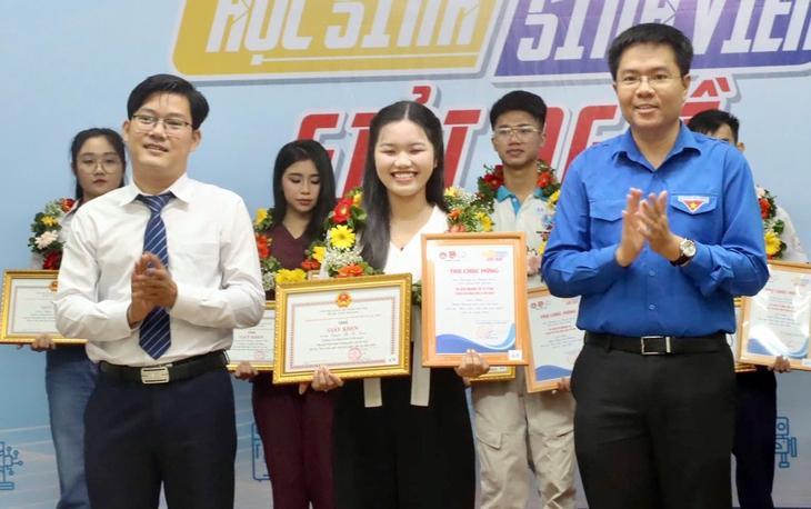 Chủ tịch Hội Sinh viên Việt Nam TP.HCM Nguyễn Đăng Khoa (bìa phải) trao giải nhất các nghề cho thí sinh của hội thi - Ảnh: LÊ HUY