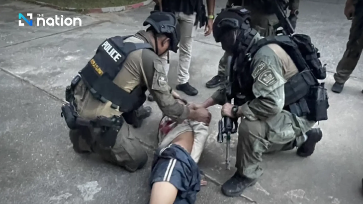 Hình ảnh do cảnh sát cung cấp cho thấy nghi phạm đi chân trần, mặc quần ngắn và áo thun, bị các sĩ quan có vũ trang khống chế và ghì xuống đất - Ảnh: THE NATION