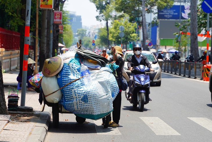 Nắng nóng gay gắt, thời tiết khắc nghiệt khiến người lao động ngoài đường đối mặt nguy cơ kiệt sức, say nắng - Ảnh: HỮU DUY