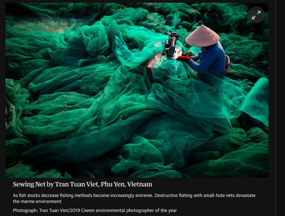 "Khi trữ lượng cá giảm đi, các phương pháp đánh bắt ngày càng trở nên cực đoan. Lưới đánh cá mắt nhỏ đang tàn phá môi trường biển", The Guardian chú thích thông điệp đáng lo đằng sau bức ảnh có tên Sewing net (Đan lưới) của Trần Tuấn Việt.