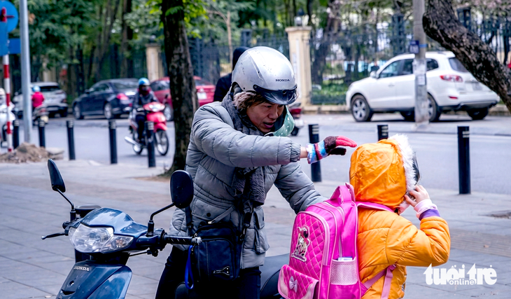 Phụ huynh Hà Nội đưa con tới trường trong ngày gió rét - Ảnh: PHẠM TUẤN