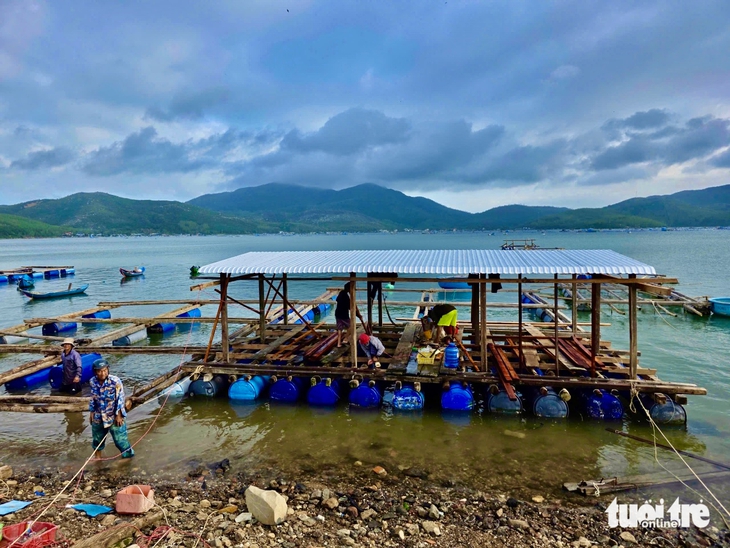 Người dân khu vực Vũng Chào, phường Sông Cầu đóng lại lồng, bè mới sau bão lũ - Ảnh: MINH CHIẾN