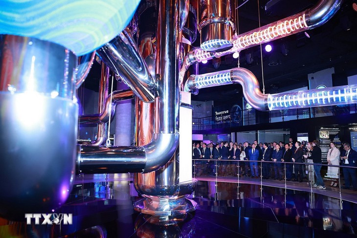Thủ tướng Phạm Minh Chính và các thành viên đoàn đã nghe lãnh đạo Tập đoàn Rosatom và lãnh đạo bảo tàng giới thiệu về lịch sử và những thành tựu hiện đại của lĩnh vực năng lượng hạt nhân Nga - Ảnh: TTXVN