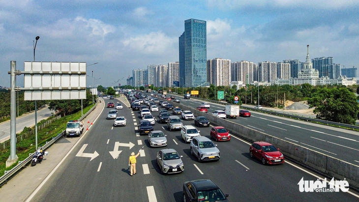 Cảnh sát giao thông phân luồng trên cao tốc Hà Nội - Hải Phòng khi lưu lượng xe tăng vọt - Ảnh: HỒNG QUANG