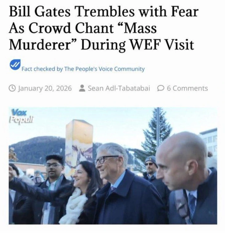 Thông tin này xuất hiện trong một bài báo đăng trên trang web The People's Voice vào ngày 20-1 với tiêu đề "Bill Gates run rẩy vì sợ khi đám đông hô vang 'kẻ giết người hàng loạt' trong chuyến tham dự WEF".