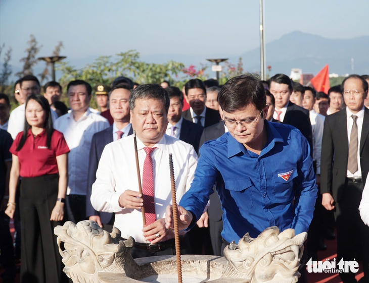 Anh Bùi Quang Huy (hàng đầu, bên phải) - Bí thư thứ nhất Trung ương Đoàn Thanh niên cộng sản Hồ Chí Minh và ông Trần Phong - Bí thư Tỉnh ủy Khánh Hòa - dâng hương tưởng niệm liệt sĩ Gạc Ma - Ảnh: TRẦN HOÀI