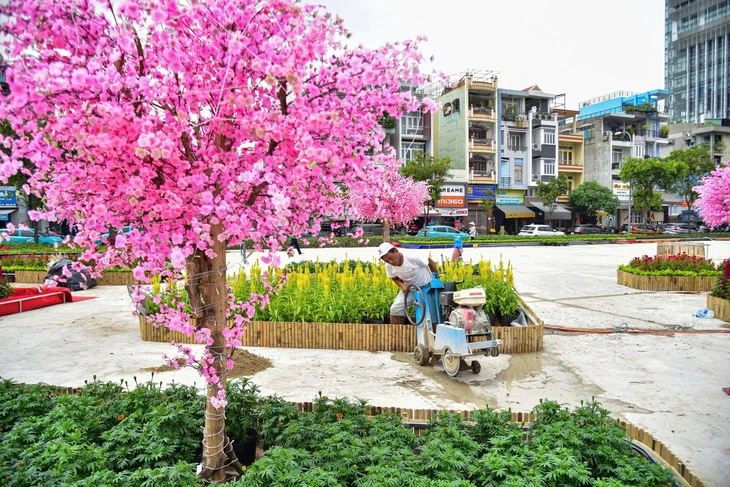 Công nhân thi công vườn hoa Tết tại khu đất số 152 Trần Phú (phường Chợ Quán, TP.HCM, khu vực quận 5 trước đây) chiều 31-1 - Ảnh: TRÍ ĐỨC