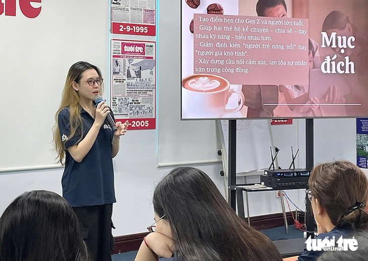 Bạn Nghê Thục Tâm thuyết trình về chiến dịch Generations Café - Quán cà phê kết nối hai thế hệ. Dự án được cả lớp đánh giá cao về tính thực tiễn - Ảnh: HỒ NHƯỠNG