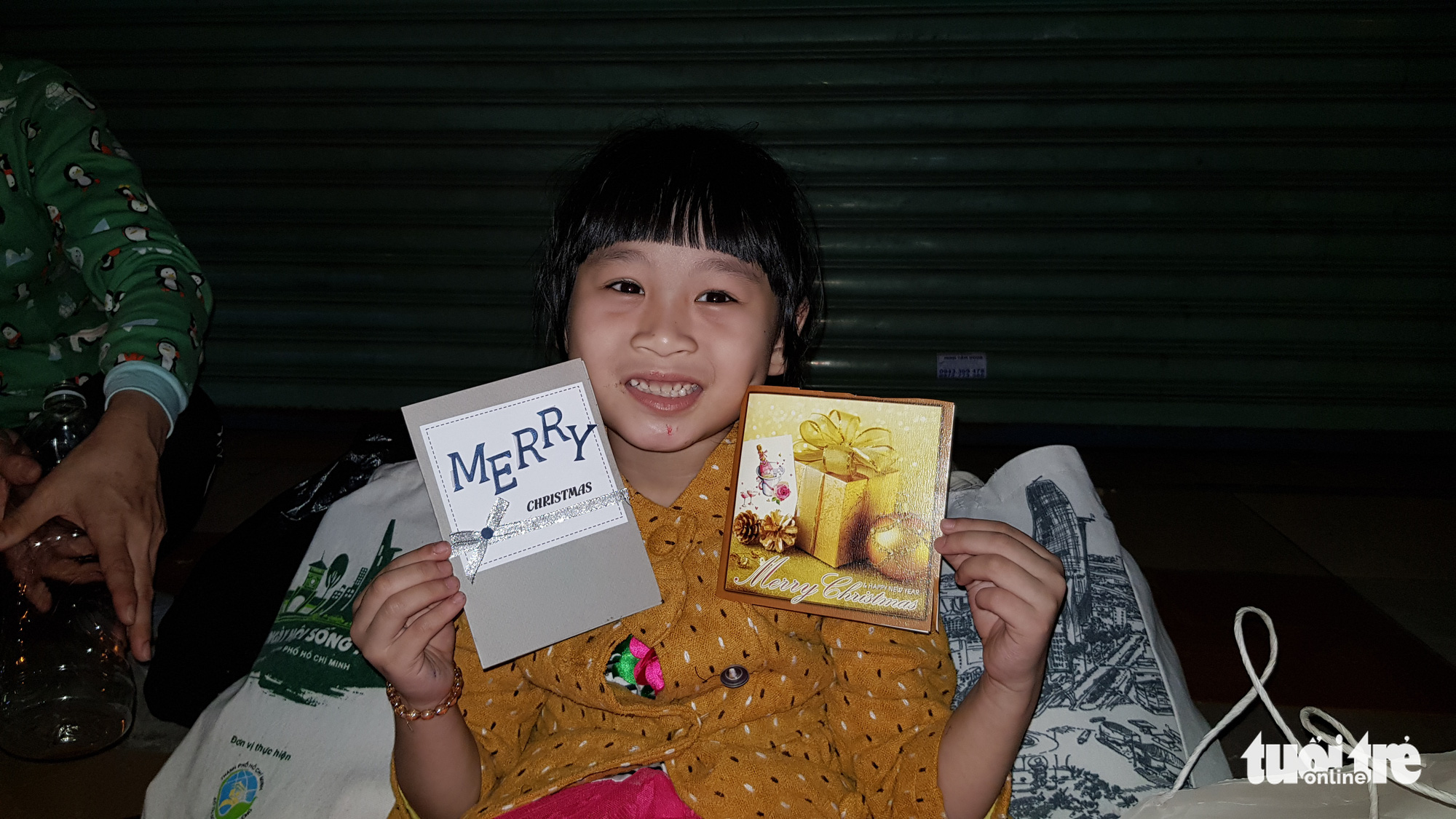 Bé Nhi tươi cùng món quà đặc biệt là hai tấm thiệp mừng Giáng sinh - Ảnh: CÔNG TRIỆU