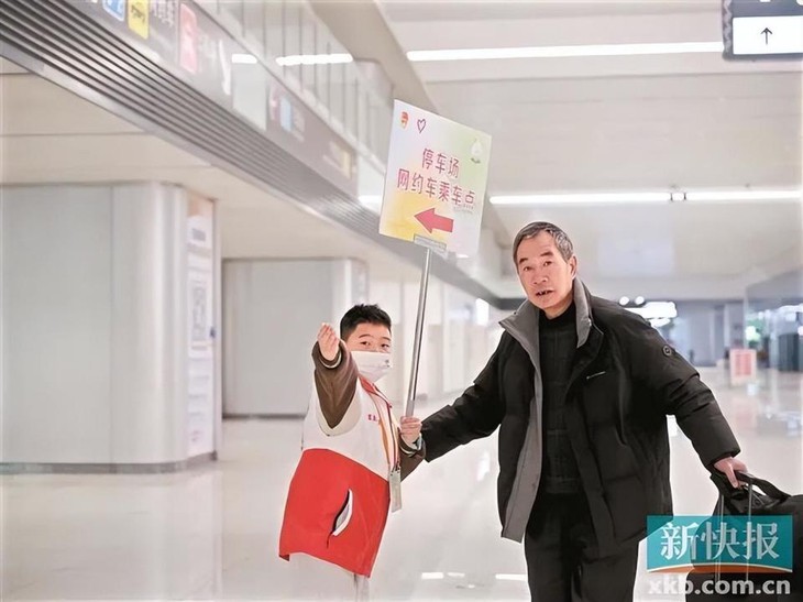 Yixuan và các bạn học mặc áo tình nguyện viên, tham gia hỗ trợ hành khách tại ga Quảng Châu Bạch Vân - Ảnh: NANFANG METROPOLIS DAILY