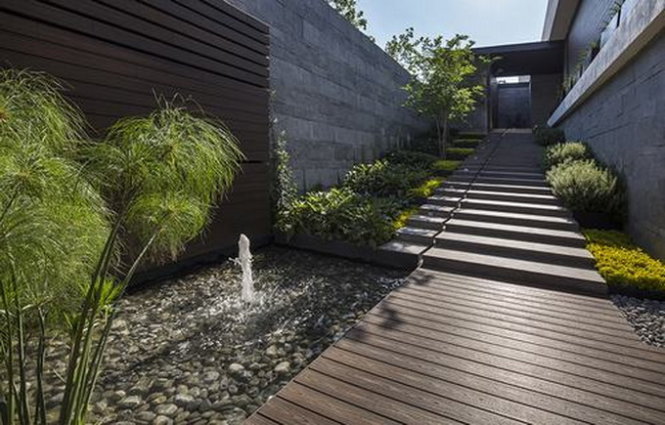 | Một lối vào được bao quanh bởi một khối nước dẫn lối vào đến sân vườn và hồ bơi |