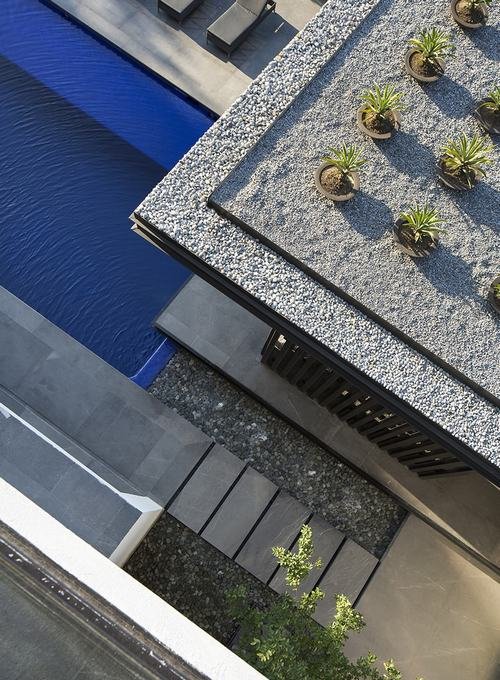 Phía bên ngoài, hồ bơi kết hợp với một mặt gương nước được bổ sung bởi một không gian mở kết nối với quầy bar và khu vực ăn uống phục vụ như là nơi sinh hoạt công cộng cho các hoạt động giải trí.
