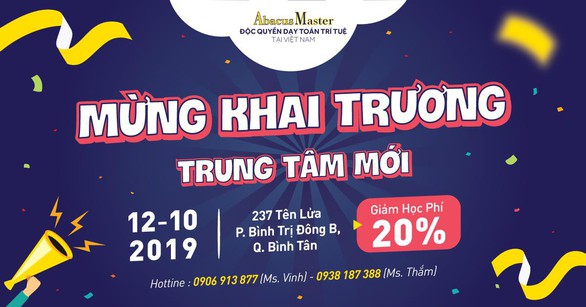 Đặc biệt, nhân dịp tưng bừng khai trương trung tâm mới vào ngày 12-10, Abacus Master Việt Nam dành tặng ưu đãi giảm 20% học phí, hơn 1000 phần quà và các buổi học trải nghiệm đang chờ đợi quý phụ huynh và các "tân binh nhí" tại 237 Tên Lửa, phường Bình Trị Đông B, quận Bình Tân - Trung tâm Toán trí tuệ Abacus Master Việt Nam.