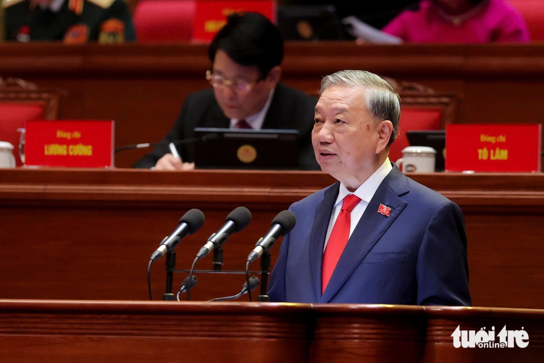 Tổng Bí thư Tô Lâm trình bày Báo cáo của Ban Chấp hành Trung ương khóa XIII về các văn kiện trình Đại hội XIV của Đảng - Ảnh: NGUYỄN KHÁNH
