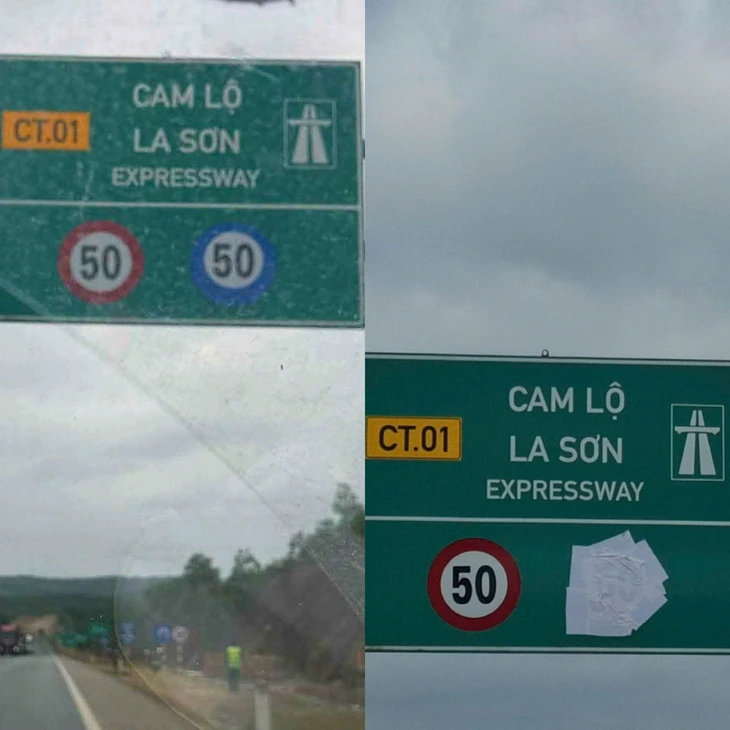 Trên biển ghi rõ tuyến đường CT01 (cao tốc) Cam Lộ - La Sơn, đồng thời quy định tốc độ tối đa và tốc độ tối thiểu đều là 50km/h.