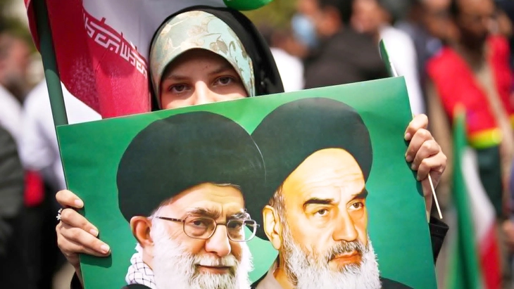 Người phụ nữ cầm ảnh hai cố lãnh tụ tối cao Iran Ali Khamenei (trái) và Ruhollah Khomeini trong cuộc biểu tình phản đối chiến dịch quân sự của Mỹ và Israel ở Tehran ngày 6-4 - Ảnh: AP