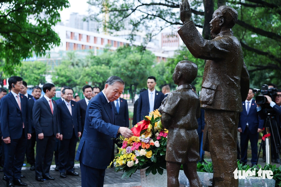 Tổng Bí thư, Chủ tịch nước Tô Lâm chỉnh vòng hoa, tưởng nhớ Chủ tịch Hồ Chí Minh tại tượng Bác Hồ trong khuôn viên di tích Trường Dục Tài Nam Ninh ở Đại học Quảng Tây - Ảnh: NGUYỄN KHÁNH