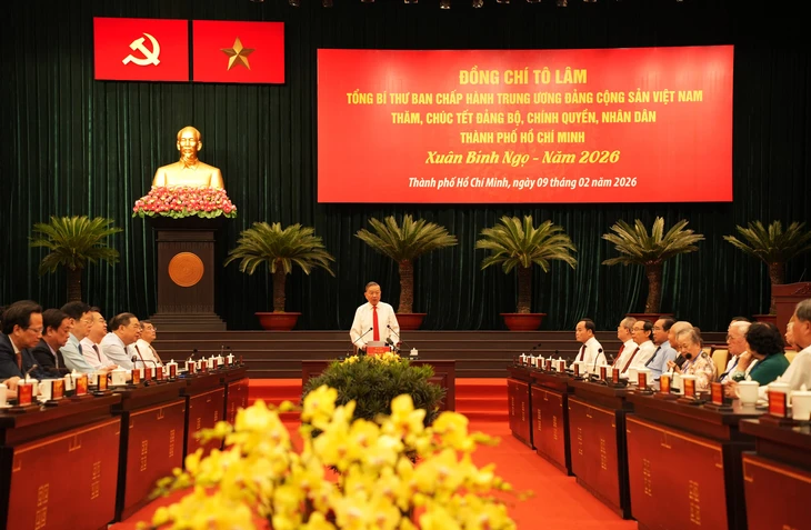 Tổng Bí thư Tô Lâm phát biểu tại buổi thăm, chúc Tết Đảng bộ, chính quyền TP.HCM - Ảnh: TIẾN LONG