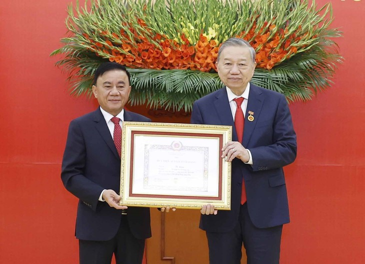 Thường trực Ban Bí thư trao Huy hiệu Đảng và chúc mừng Tổng Bí thư Tô Lâm - Ảnh: TTXVN
