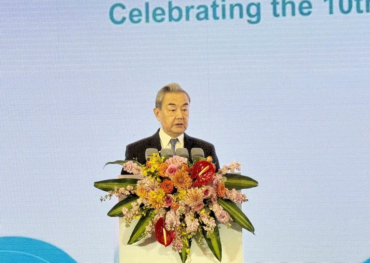 Ngoại trưởng Trung Quốc Vương Nghị phát biểu tại Lễ kỷ niệm 10 năm Hội nghị Cấp cao Hợp tác Mekong - Lan Thương lần thứ nhất tối 23-3 - Ảnh: TTXVN