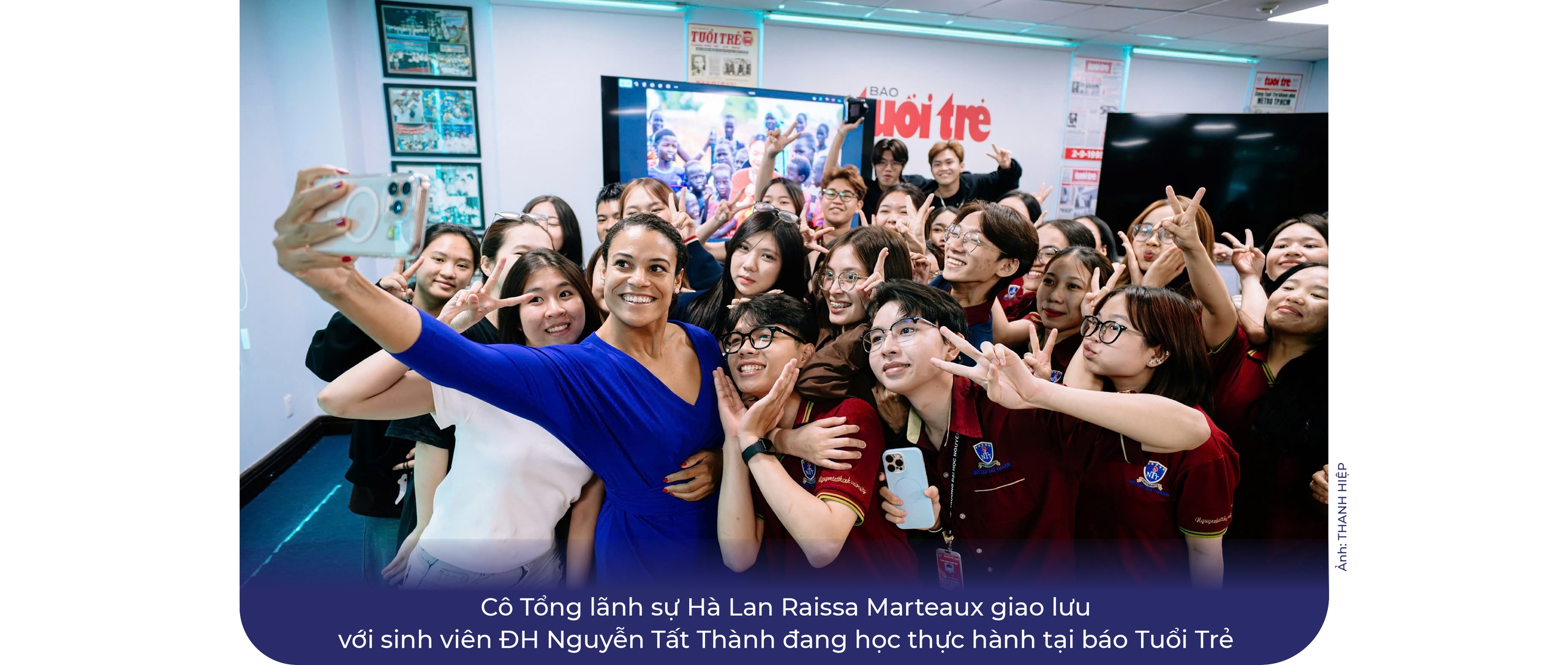 Cô Tổng lãnh sự Hà Lan Raissa Marteaux giao lưu với sinh viên ĐH Nguyễn Tất Thành đang học thực hành tại báo Tuổi Trẻ - Ảnh: THANH HIỆP