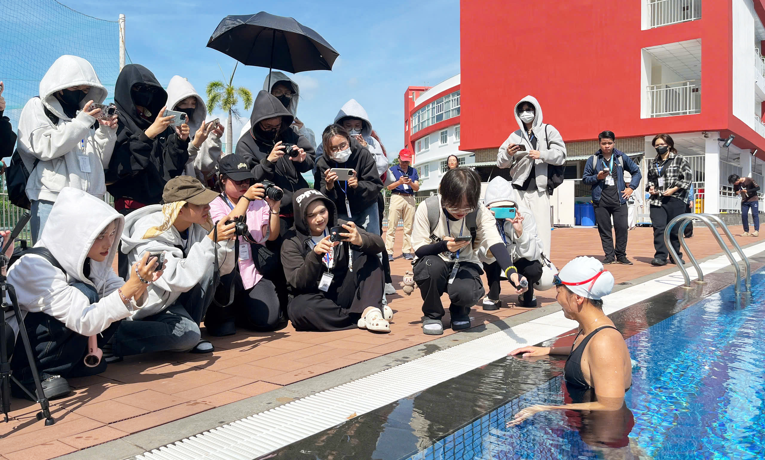 Sinh viên ĐH Nguyễn Tất Thành thực hành tác nghiệp trong sự kiện báo Tuổi Trẻ tổ chức với "Tiểu tiên cá" Ánh Viên - Ảnh: HỒ NHƯỠNG