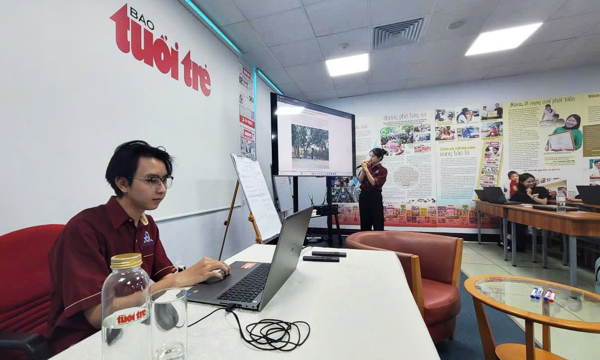 Sinh viên ĐH Nguyễn Tất Thành thuyết trình sản phẩm thực hành trên lớp ở báo Tuổi Trẻ - Ảnh: HOÀNG GIÁM