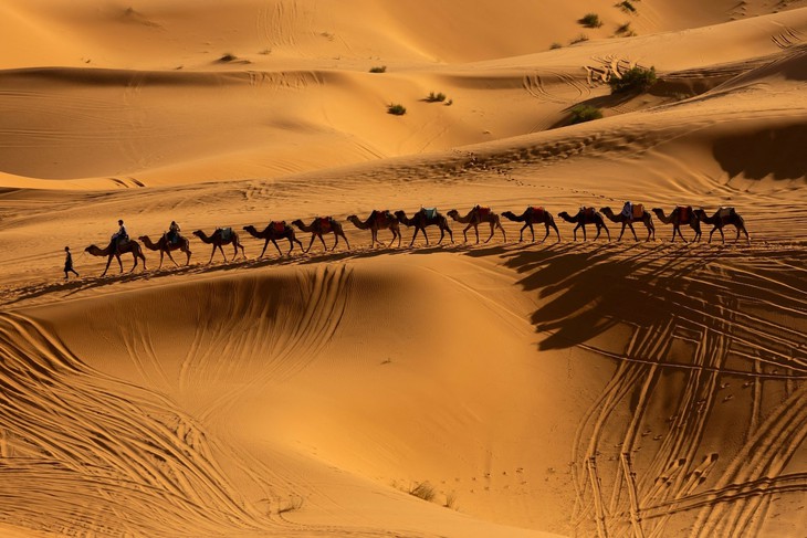 Một đoàn lạc đà di chuyển dọc theo một cồn cát tại cồn cát Erg Chebbi nằm trong sa mạc Sahara, Merzouga, Morocco - Ảnh: REUTERS