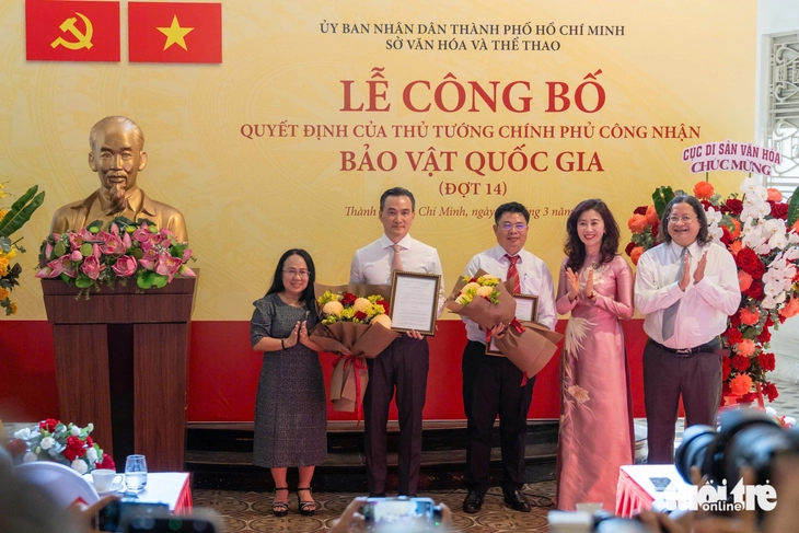 Lãnh đạo Cục Di sản văn hóa, lãnh đạo TP.HCM trao quyết định công nhận bảo vật quốc gia - Ảnh: VĂN TRUNG