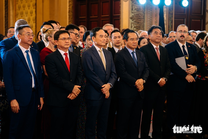 Thứ hai từ trái sang: Phó chủ tịch UBND TP.HCM Nguyễn Mạnh Cường; Bí thư Thành ủy TP.HCM Trần Lưu Quang; Chủ tịch UBND TP Nguyễn Văn Được; Phó chủ tịch thường trực UBND TP Nguyễn Lộc Hà cùng các đại biểu tham dự chương trình gặp gỡ các cơ quan đại diện nước ngoài tại thành phố nhân dịp năm mới 2026 và mừng xuân Bính Ngọ tối 9-2 - Ảnh: THANH HIỆP