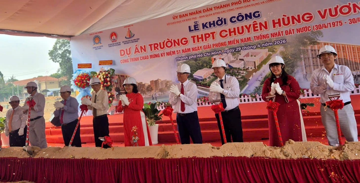 Lãnh đạo TP.HCM, Sở Giáo dục và Đào tạo TP.HCM thực hiện nghi lễ khởi công xây dựng Trường THPT chuyên Hùng Vương - Ảnh: T.L.