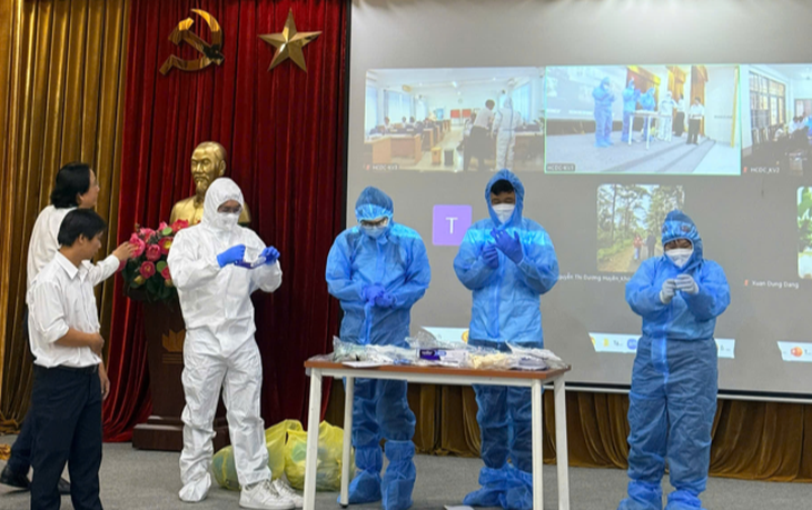 Các thành viên đội đáp ứng nhanh (RRT) được hướng dẫn sử dụng đúng cách phương tiện phòng hộ cá nhân - Ảnh: HCDC cung cấp