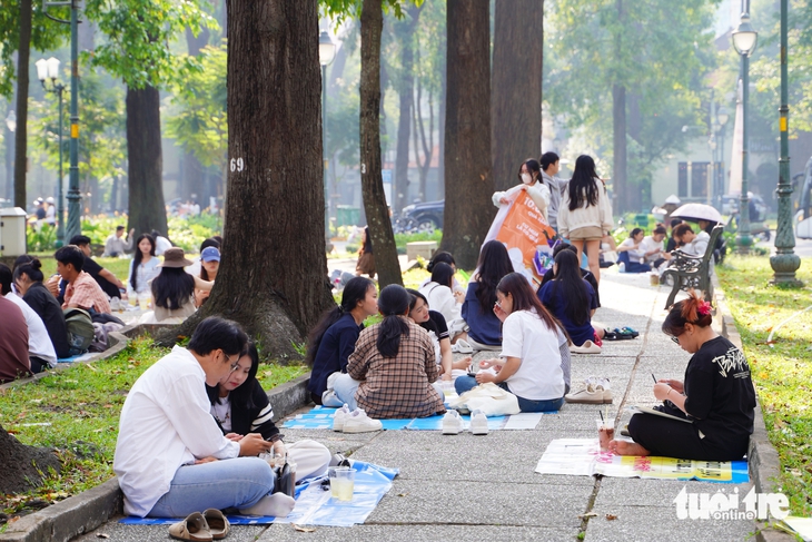 Tại công viên 30 Tháng 4, dưới những tán cây xanh, từng nhóm bạn trẻ trải bạt ngồi "cà phê bệt", trò chuyện rôm rả.