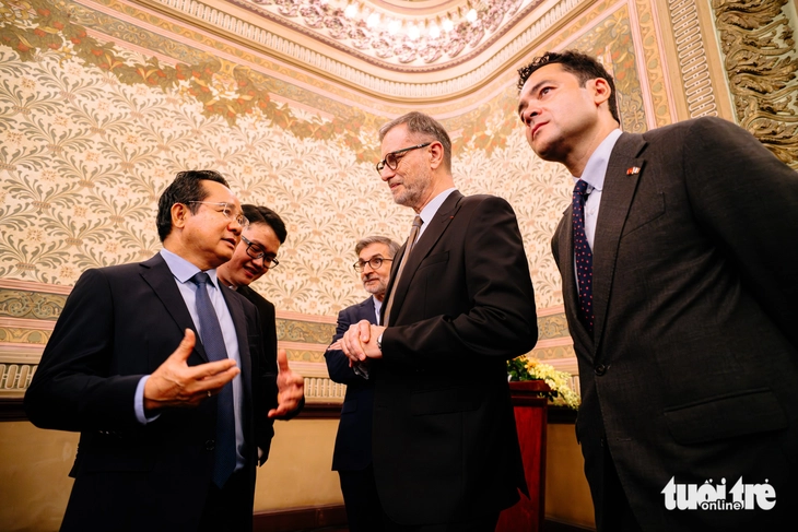 Đại sứ Pháp tại Việt Nam Olivier Brochet (giữa) làm việc bên lề với Chủ tịch UBND TP.HCM Nguyễn Văn Được - Ảnh: THANH HIỆP