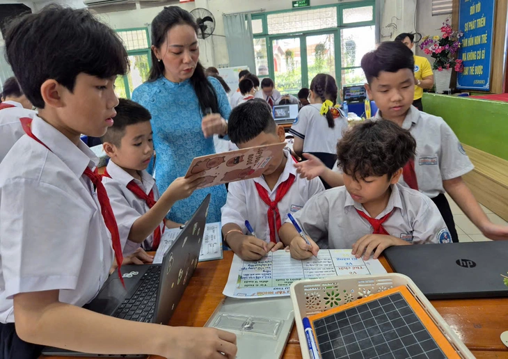Tiết dạy môn khoa học ở lớp 5/4 Trường tiểu học Đống Đa (phường Tân Hòa, TP.HCM) của cô Nguyễn Thị Hòa vào ngày 22-4 thật đặc biệt. Phòng học không chỉ có tivi thông minh đã tích hợp AI mà trên bàn học của học sinh đã được trang bị sẵn máy tính, iPad cùng bảng con, bút màu, phiếu học tập...