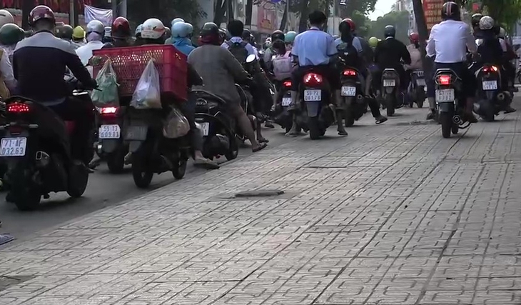 Mặc dù mức phạt cao nhưng vẫn còn nhiều xe máy cố tình vi phạm đi trên vỉa hè - Ảnh: PC08