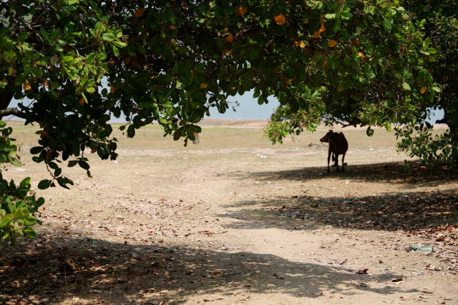 | Một con bò trốn nắng dưới tán cây điều ven hồ Đắk Mil - Ảnh: Tiến Thành |
