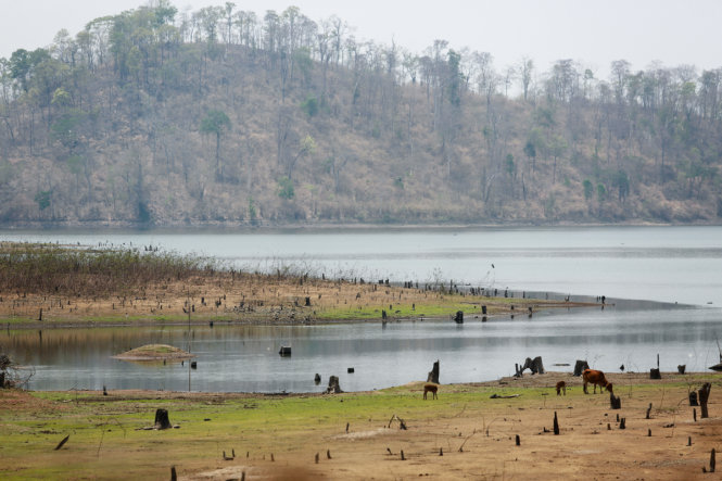 | Một đàn bò gặm cỏ trên lòng hồ cạn, xung quanh la những thân cây khô trồi lên trên mặt hồ - Ảnh: Tiến Thành |