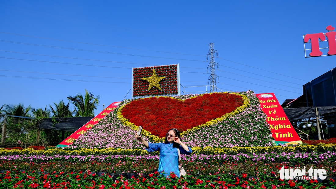Du khách check-in với tiểu cảnh lá cờ và "trái tim làng hoa" tại Tổ sản xuất và cung ứng hoa kiểng khóm Tân An - Ảnh: ĐẶNG TUYẾT