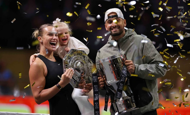 Sabalenka và Nick Kyrgios cùng nhận cúp sau trận đấu quần vợt được gọi là “trận chiến giữa hai giới” - Ảnh: Reuters
