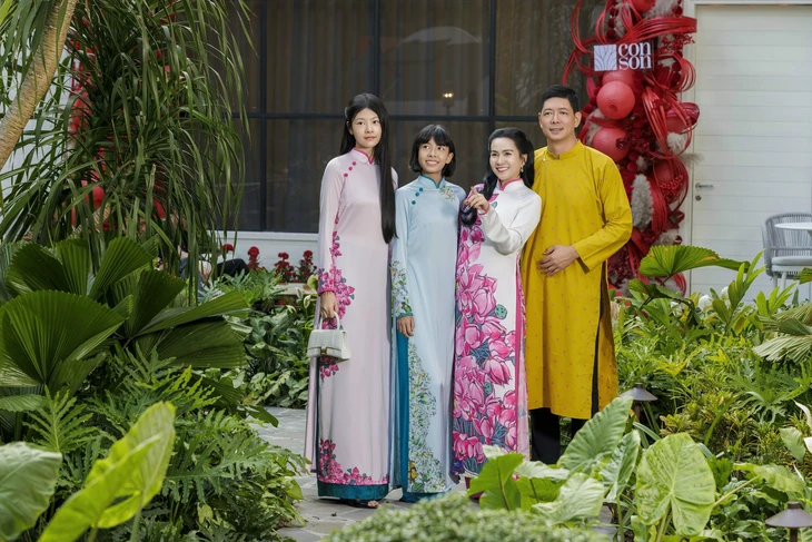 Vợ chồng diễn viên Bình Minh và các con diện áo dài Tết của nhà thiết kế Hồ Trần Dạ Thảo - Ảnh: Nhà thiết kế cung cấp