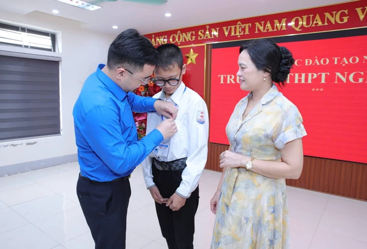 Anh Hồ Phúc Hải - Phó bí thư thường trực Tỉnh Đoàn Nghệ An - thừa ủy quyền của Trung ương Đoàn trao tặng huy hiệu Tuổi trẻ dũng cảm và bằng khen của Ban Chấp hành Trung ương Đoàn cho em Võ Hoàng Thành - Ảnh: TÂM PHẠM