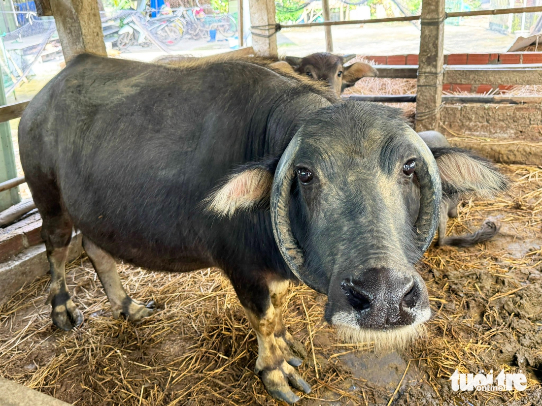 Cặp sừng khác lạ so với con trâu khác ở trong chuồng - Ảnh: LÊ TRUNG