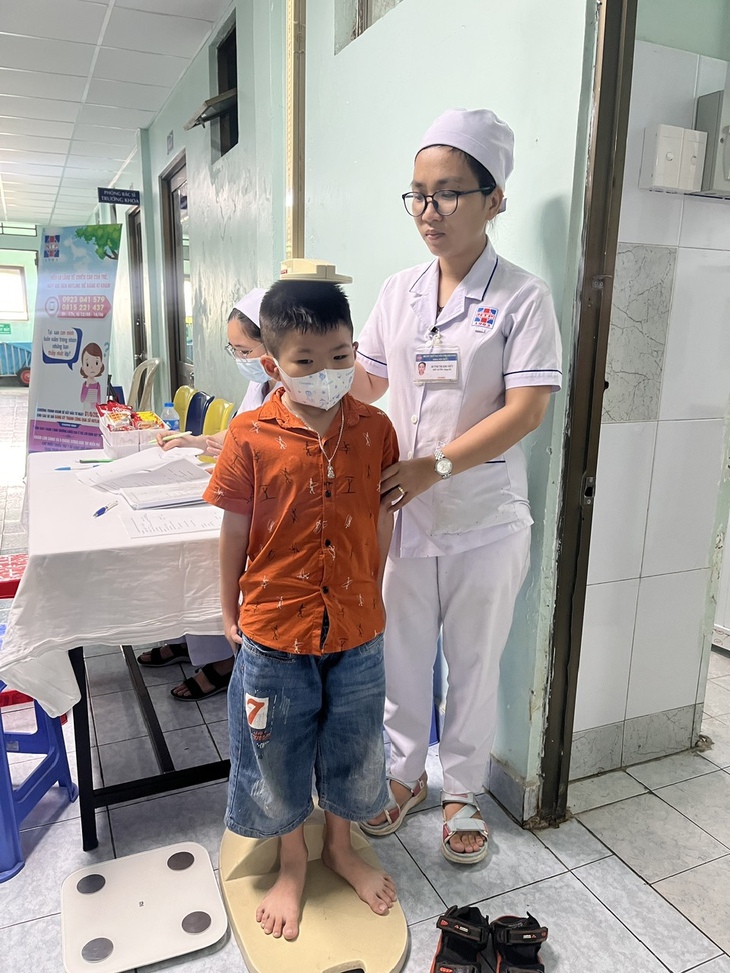 Nhân viên y tế Bệnh viện Nguyễn Tri Phương TP.HCM đang đo chiều cao cho một bệnh nhi - Ảnh: THÙY DƯƠNG