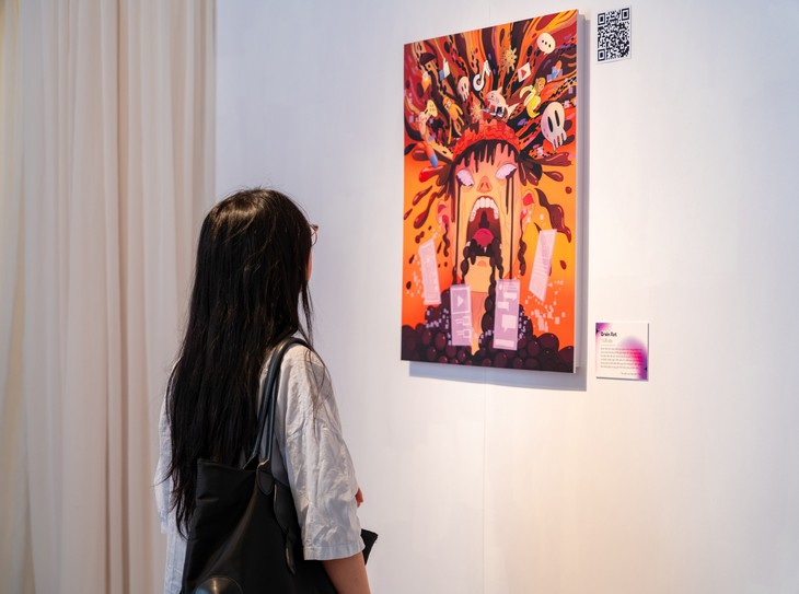 Các bạn trẻ khám phá thế giới do "AI slop" tạo ra tại triển lãm "Nhiễu số" - Ảnh: PHƯƠNG THẢO